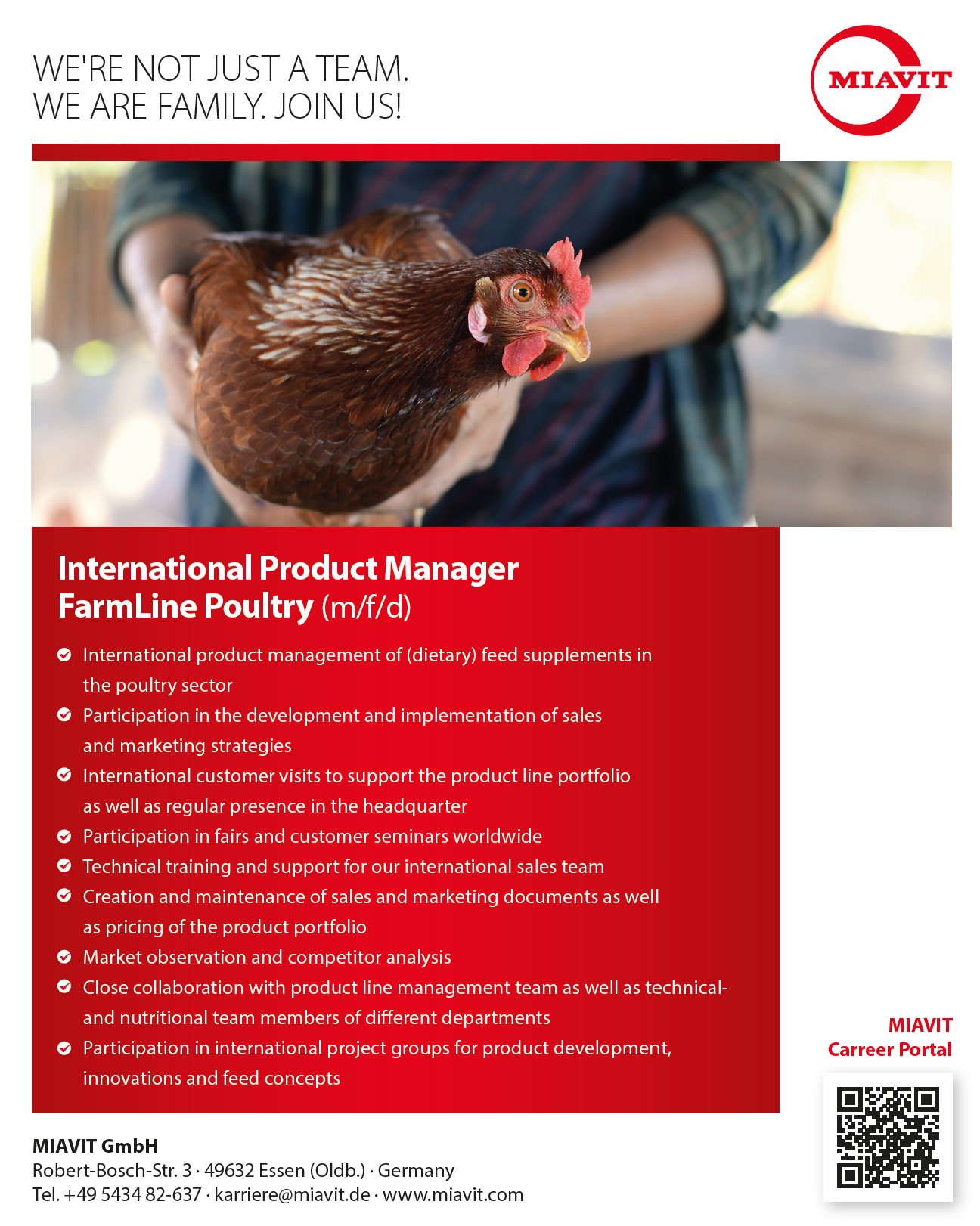 MIAVIT is an internationally operating company headquartered in Essen (Oldenburg, Germany). With over 600 employees, we produce and distribute premixes and specialty products for both agricultural animal nutrition and the pet sector in more than 90 countries. To expand our team, we are seeking a International Product Manager FarmLine Poultry (m/f/d) to begin as soon as possible.