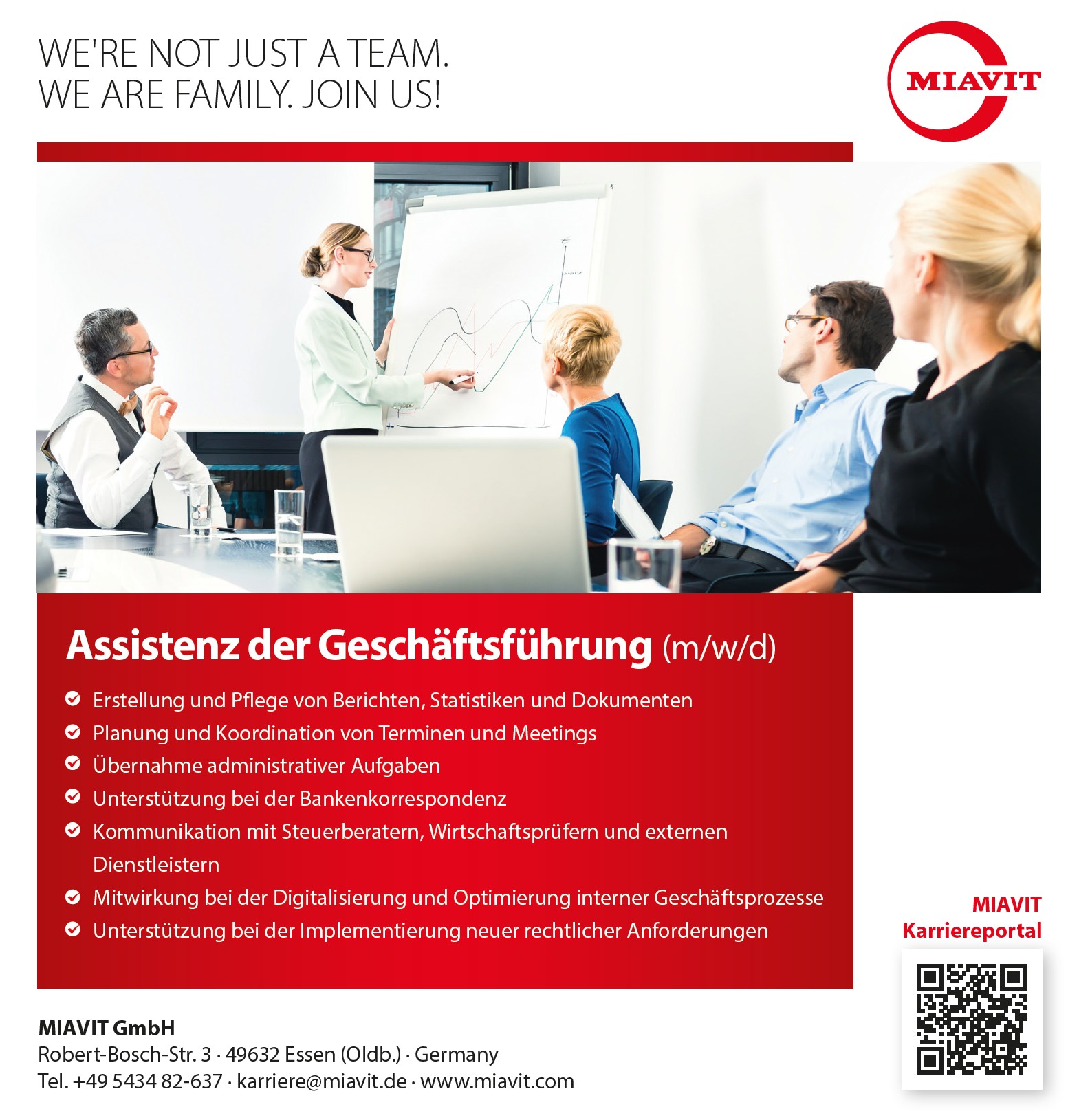 MIAVIT ist ein international agierendes Unternehmen mit Hauptsitz in Essen (Oldb.). Mit über 600 Mitarbeitenden produzieren und vertreiben wir in mehr als 90 Ländern Vormischungen und Spezialprodukte sowohl für die landwirtschaftliche Tierernährung als auch für den Heimtierbereich. Zur Erweiterung unseres Teams suchen wir zum nächstmöglichen Zeitpunkt eine Assistenz der Geschäftsführung (m/w/d).