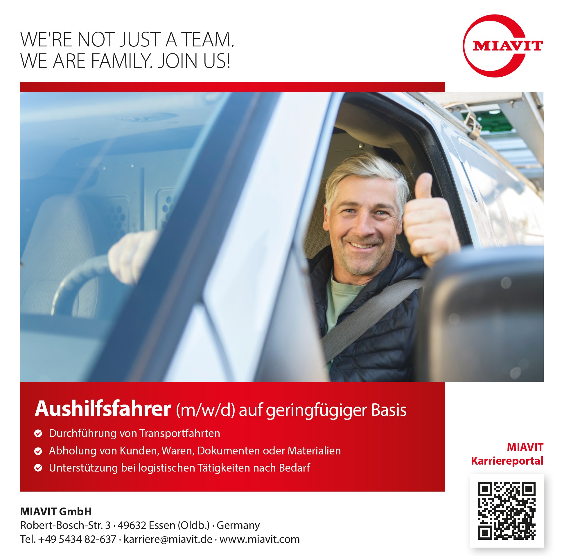 MIAVIT ist ein international agierendes Unternehmen mit Hauptsitz in Essen (Oldb.). Mit über 600 Mitarbeitenden produzieren und vertreiben wir in mehr als 90 Ländern Vormischungen und Spezialprodukte sowohl für die landwirtschaftliche Tierernährung als auch für den Heimtierbereich. Zur Erweiterung unseres Teams suchen wir zum nächstmöglichen Zeitpunkt einen Aushilfsfahrer (m/w/d) auf geringfügiger Basis.