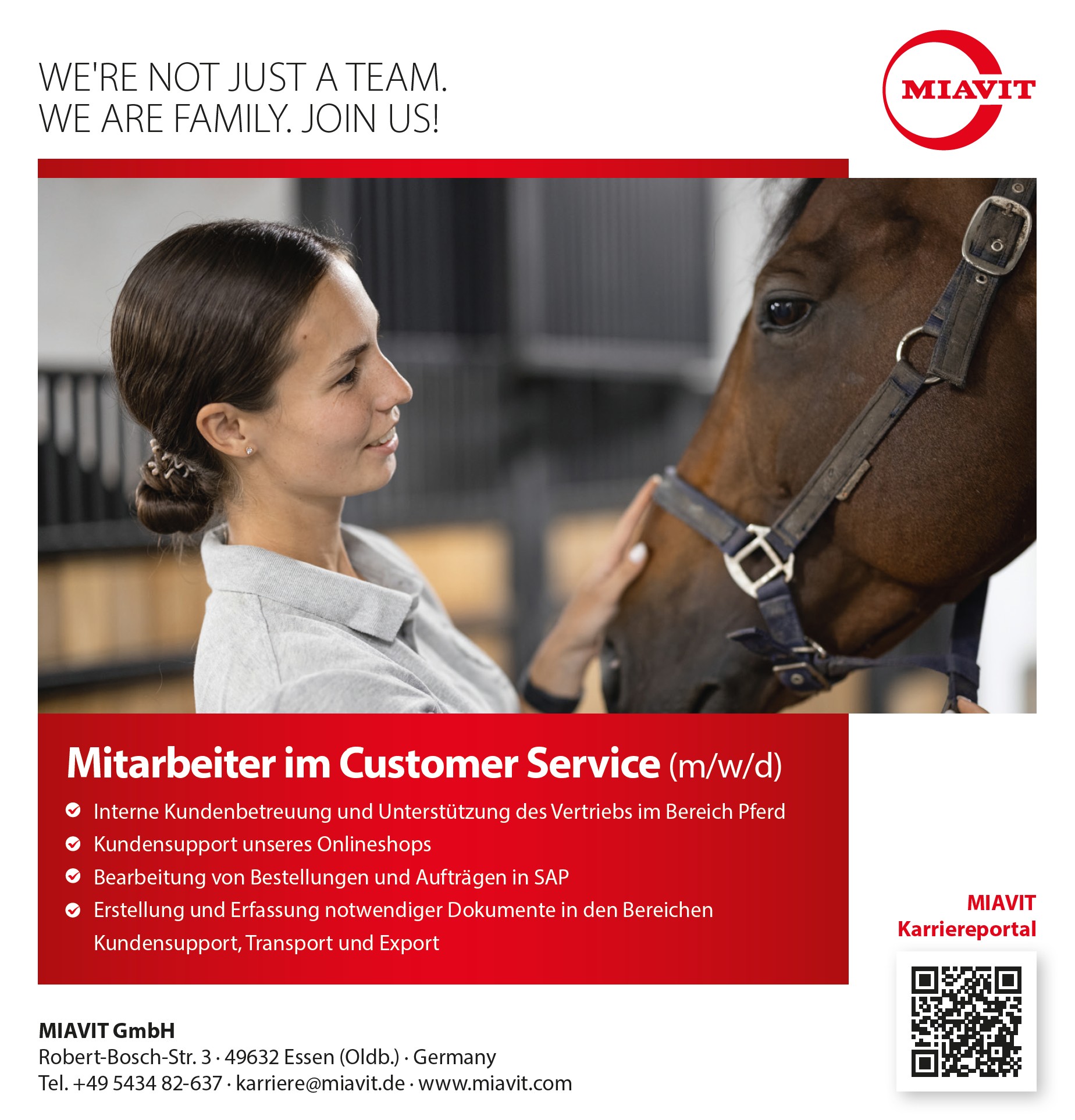 MIAVIT ist ein international agierendes Unternehmen mit Hauptsitz in Essen (Oldb.). Mit über 600 Mitarbeitenden produzieren und vertreiben wir in mehr als 90 Ländern Vormischungen und Spezialprodukte sowohl für die landwirtschaftliche Tierernährung als auch für den Heimtierbereich. Zur Erweiterung unseres Teams suchen wir zum nächstmöglichen Zeitpunkt einen Mitarbeiter im Customer Service (m/w/d) im Bereich Pferd.
