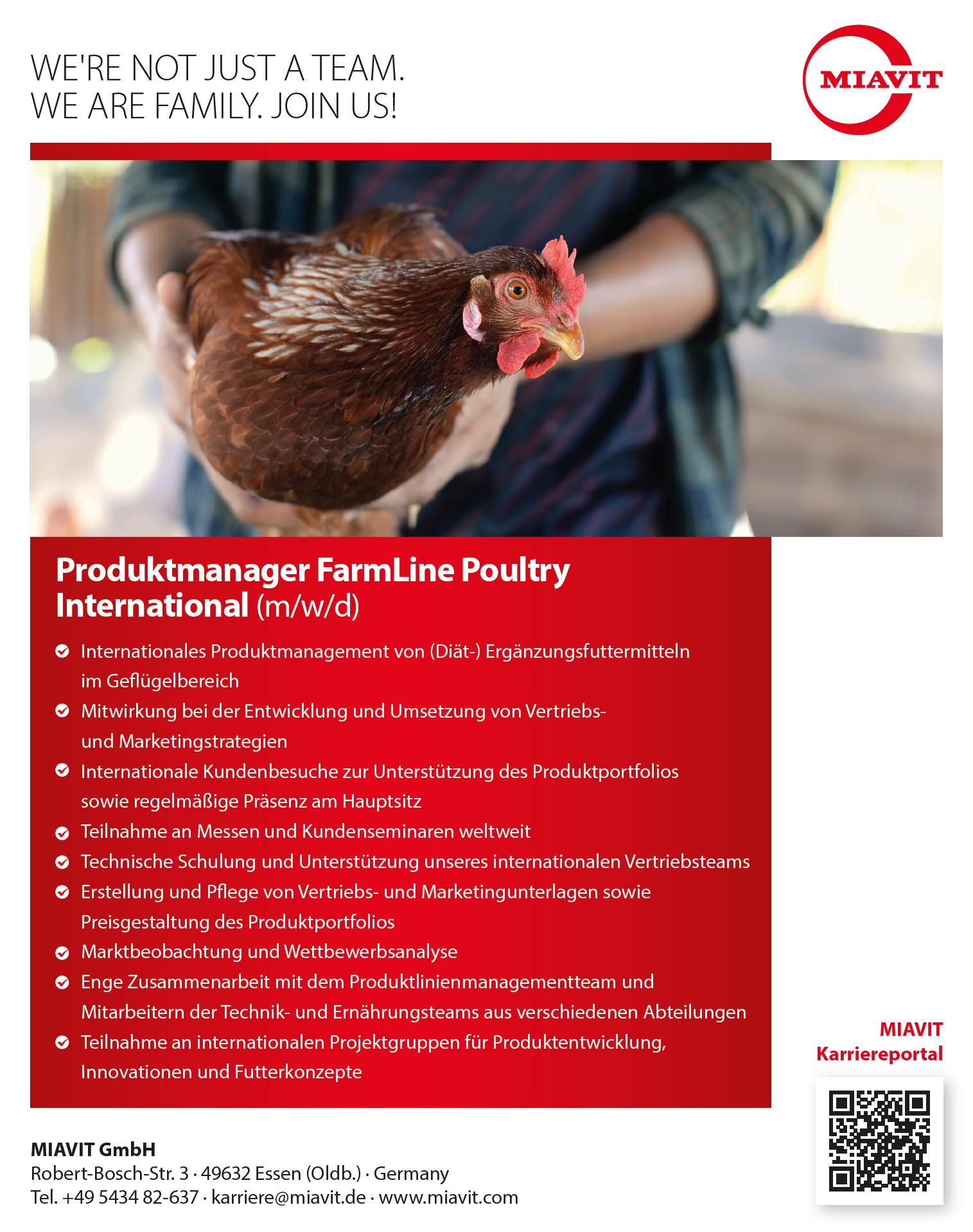 MIAVIT ist ein international agierendes Unternehmen mit Hauptsitz in Essen (Oldb.). Mit über 600 Mitarbeitenden produzieren und vertreiben wir in mehr als 90 Ländern Vormischungen und Spezialprodukte sowohl für die landwirtschaftliche Tierernährung als auch für den Heimtierbereich. Zur Erweiterung unseres Teams suchen wir zum nächstmöglichen Zeitpunkt einen Produktmanager Farmline Poultry International (m/w/d).