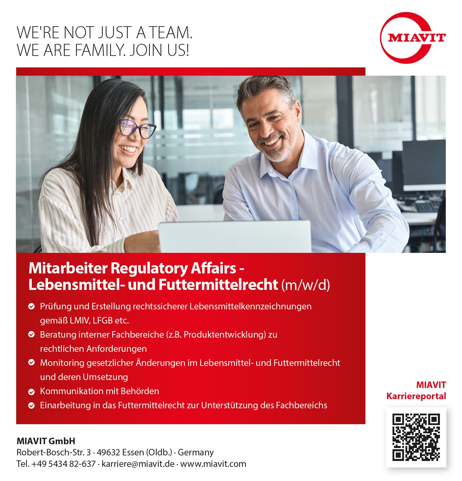 MIAVIT ist ein international agierendes Unternehmen mit Hauptsitz in Essen (Oldb.). Mit über 600 Mitarbeitenden produzieren und vertreiben wir in mehr als 90 Ländern Vormischungen und Spezialprodukte sowohl für die landwirtschaftliche Tierernährung als auch für den Heimtierbereich. Zur Erweiterung unseres Teams suchen wir zum nächstmöglichen Zeitpunkt einen Mitarbeiter Regulatory Affairs - Lebensmittel- und Futtermittelrecht (m/w/d).